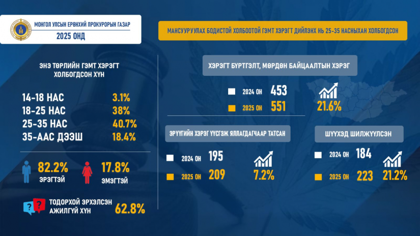 Прокурорын байгууллагаас 2025 онд хяналт тавьсан авлига, мансууруулах эм, сэтгэцэд нөлөөт бодисыг хууль бусаар ашиглах гэмт хэрэг өсөж, мөнгө угаах гэмт хэрэг буурсан байна.