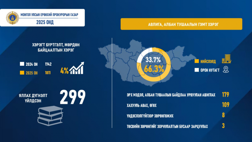 Прокурорын байгууллага 2025 онд авлига, албан тушаалын 1,811 хэрэгт хяналт тавьсан нь өмнөх оноос 69 буюу 4 хувиар өссөн байна. Нийт хэргийн 66.3 хувь нь нийслэлд, 33.7 хувь нь орон нутагт бүртгэгдсэн байна.