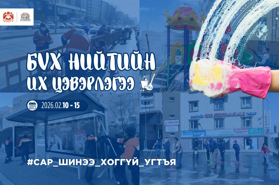 Улаанбаатар хотын нийтийн эзэмшлийн гудамж, зам, талбай, гэр болон орон сууцны хорооллын цэвэрлэгээ үйлчилгээг сайжруулах, иргэдийн ая тухтай ажиллаж, амьдрах орчин, нөхцөлийг бүрдүүлэх зорилгоор сар шинийн баярыг угтсан бүх нийтийн их цэвэрлэгээг энэ сарын 10-15-ны өдрүүдэд зохион байгуулна.