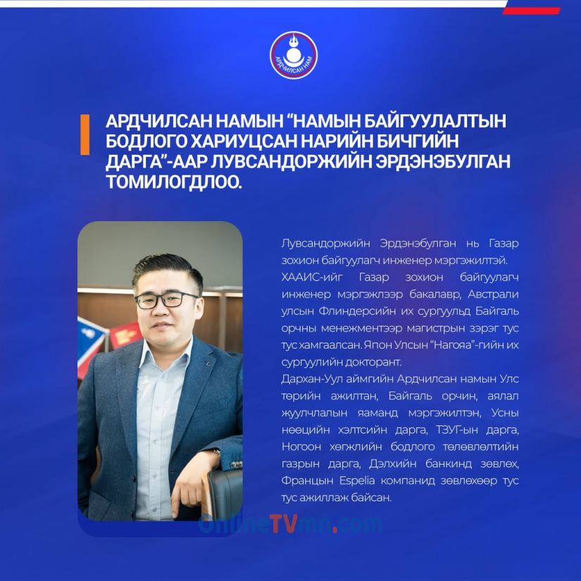 Ардчилсан Намын “Намын байгуулалтын бодлого хариуцсан Нарийн бичгийн дарга”-аар Лувсандоржийн Эрдэнэбулган томилогдлоо.