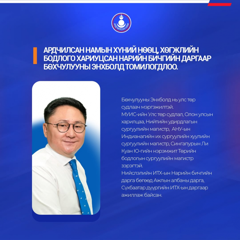 Ардчилсан Намын Хүний нөөц, хөгжлийн бодлого хариуцсан Нарийн бичгийн даргаар Бөхчулууны Энхболд томилогдлоо.