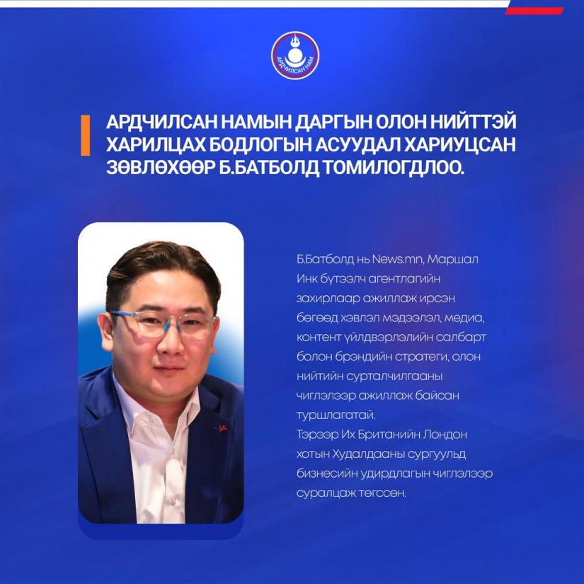 Ардчилсан Намын даргын шийдвэрээр Олон нийттэй харилцах бодлогын асуудал хариуцсан зөвлөхөөр Болдбаатарын Батболд томилогдлоо.