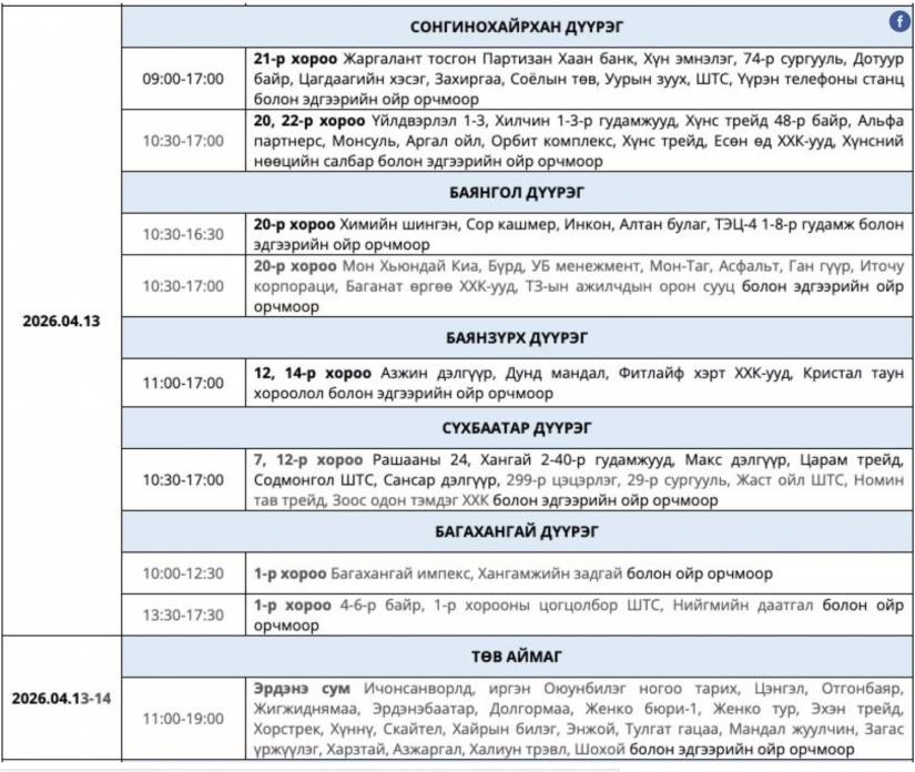 Өнөөдөр /2026.04.13/ дараах байршлуудад цахилгаан хязгаарлана