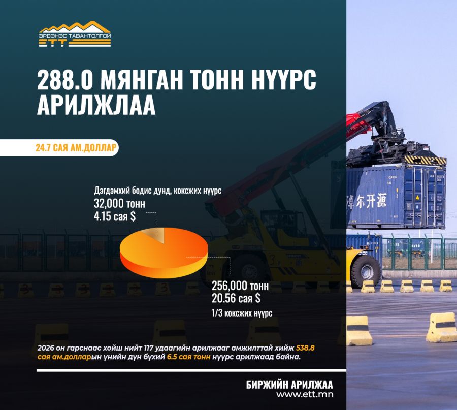 Дэгдэмхий бодис дунд, коксжих нүүрс- 32.0 мянган тонн, 129.7 ам.доллароор арилжаалж нийт 4.15 сая ам.долларын үнийн дүнтэйгээр амжилттай хэлцэл хийгдлээ