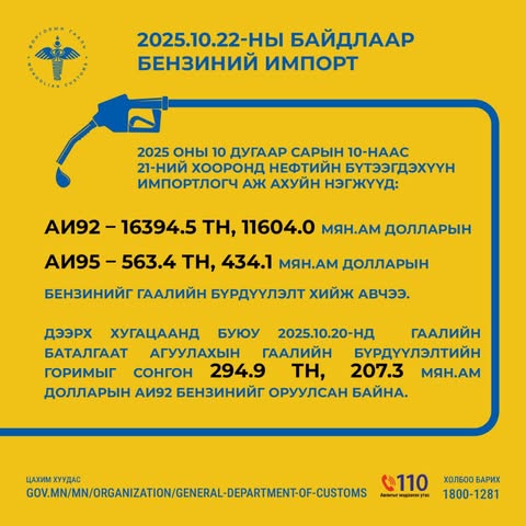 Өнгөрсөн оны 2024.10.12-оос энэ оны 10.21-ний хооронд шатахуун импортлогч компаниуд АИ92 -16264.4 тн, 11511.9 мян.ам.долларын, АИ95 - 58.2 тн, 47.7 мян.ам.долларын бензинд гаалийн бүрдүүлэлт хийжээ.