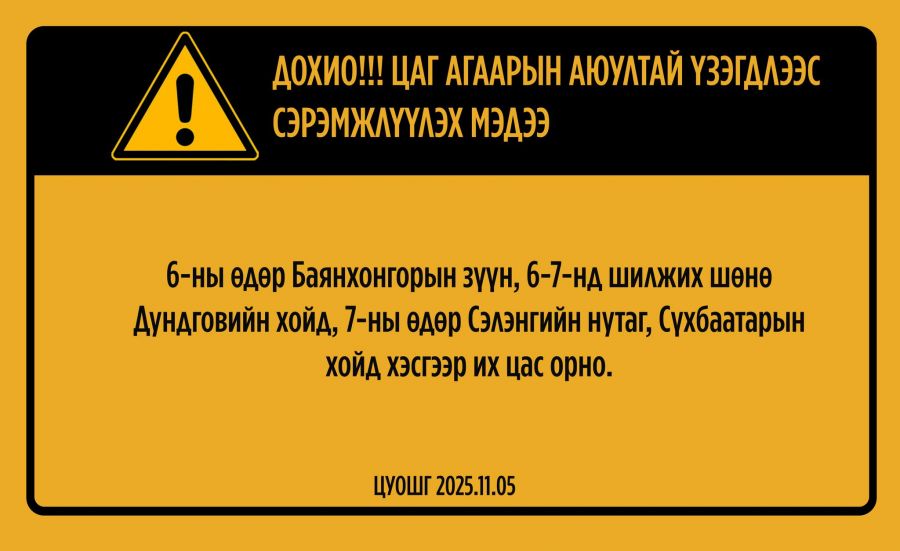 Энэ сарын 6-7-ны өдрүүдэд цаг агаарын гамшигт болон аюултай үзэгдэл болох тул иргэд, малчид, тээвэрчид та бүхнийг мэргэжлийнн байгууллагаас өгч байгаа заавар, зөвлөмжийг дагаж, аюулгүй байдлаа хангахыг зөвлөж байна.
