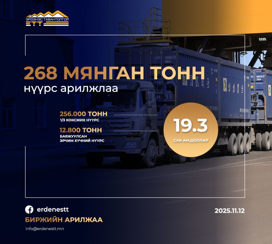 "Эрдэнэс Тавантолгой" ХК 2025 оны 11 дүгээр сарын 12-ны өдөр Монголын Хөрөнгийн Биржээр дамжуулан 2 удаагийн арилжаа хийж 19.3 сая ам.долларын үнийн дүн бүхий 268.8 мянган тонн нүүрс БНХАУ-ын Мандал боомт хүргэж өгөх нөхцөлөөр амжилттай арилжааллаа.