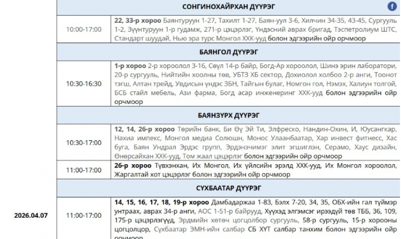 Өнөөдөр /2025.04.07/ дараах 11 байршилд 10:20 цаг хүртэл цахилгааны хязгаарлалт хийх юм байна.