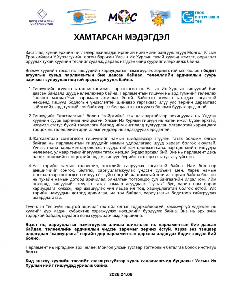 Иргэний нийгмийн байгууллагууд УИХ-ын гишүүнийг эгүүлэн татах хуулийг хэлэлцэхгүйгээр хууль санаачлагчид буцаахыг уриалж, хамтарсан мэдэгдэл гаргасан байна. Энэ мэдэгдэлд, Засаглал, хүний эрхийн чиглэлээр ажилладаг иргэний нийгмийн байгууллагууд Монгол Улсын Ерөнхийлөгч У.Хүрэлсүхийн өргөн барьсан УИХ-ын тухай хуульд нэмэлт өөрчлөлт оруулах тухай хуулийн төслийг судалж, уг хуулийг буцаах нэгдсэн байр суурийг илэрхийлж байна. Энэхүү хуулийн төсөл нь парламентын бие даасан байдал, төлөөллийн ардчиллын суурь зарчмыг сулруулах ноцтой эрсдэл үүсгэж байна гэж мэдэгджээ.