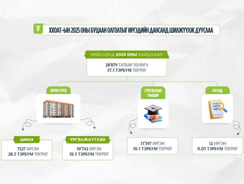 2025 оны хөнгөлөлт буцаан олголтыг иргэдийн дансанд энэ сарын 20-ноос шилжүүлж эхэлсэн бөгөөд өнөөдөр шилжүүлж дууслаа. 2025 оны жилийн эцсийн тайлангаар 28,879 татвар төлөгч иргэн 57.1 тэрбум төгрөгийн буцаан олголтыг авахаар тайлангаа ирүүлсэн юм. Тодруулбал, шинээр орон сууц худалдан аваад анх удаа хөнгөлөлт чөлөөлөлтөд хамрагдаж байгаа 7,527 иргэнд 28.5 тэрбум төгрөг, үргэлжлүүлэн хамрагдаж байгаа 10,742 иргэнд 18.5 тэрбум төгрөг, сургалтын төлбөрийн хөнгөлөлтөд хамрагдаж байгаа 11,397 иргэнд 10.1 тэрбум төгрөг, хуульд заагдсан бусад нөхцөлөөр 12 иргэнд 30 орчим сая төгрөгийн буцаан олголтыг олгожээ.